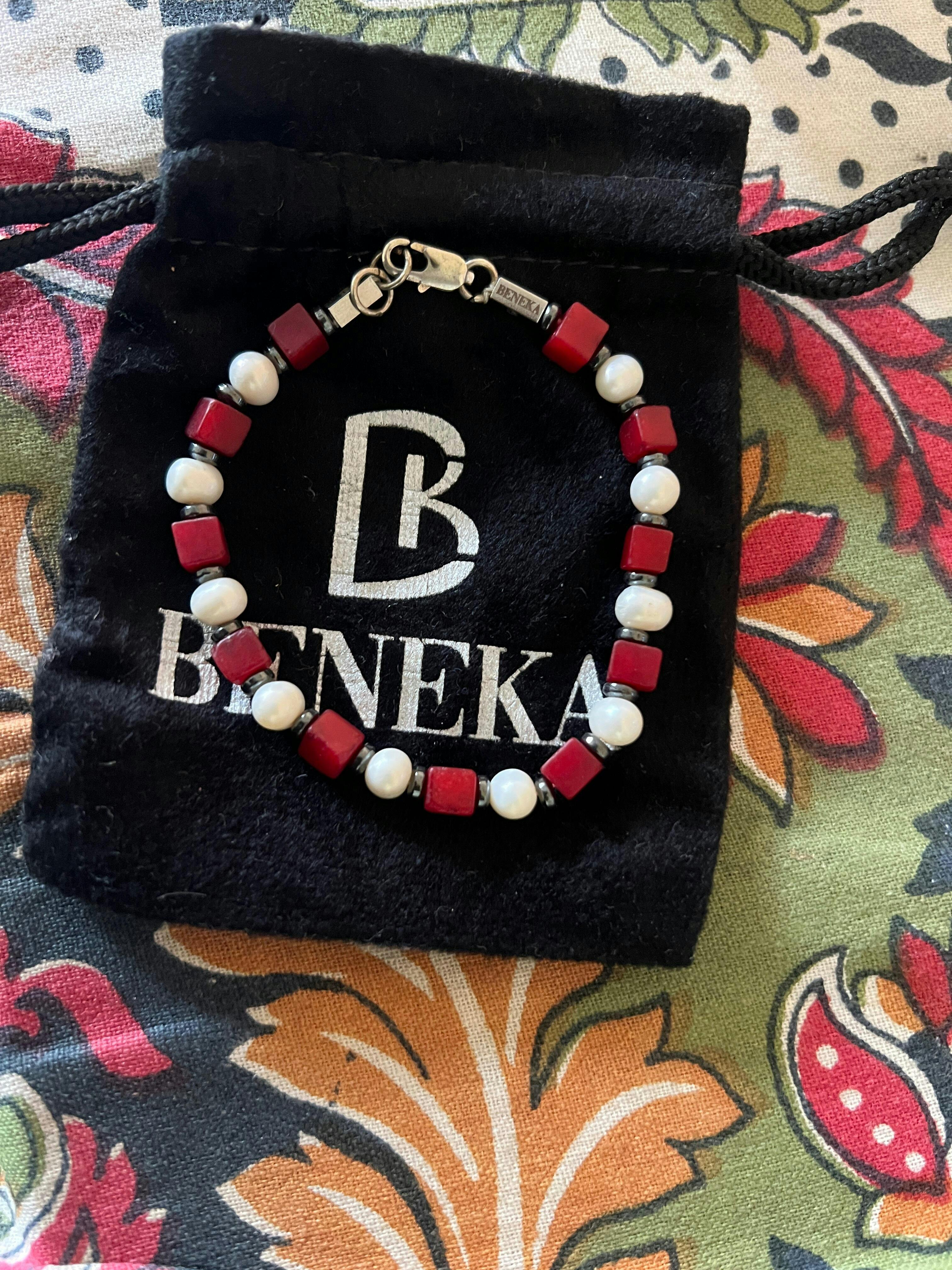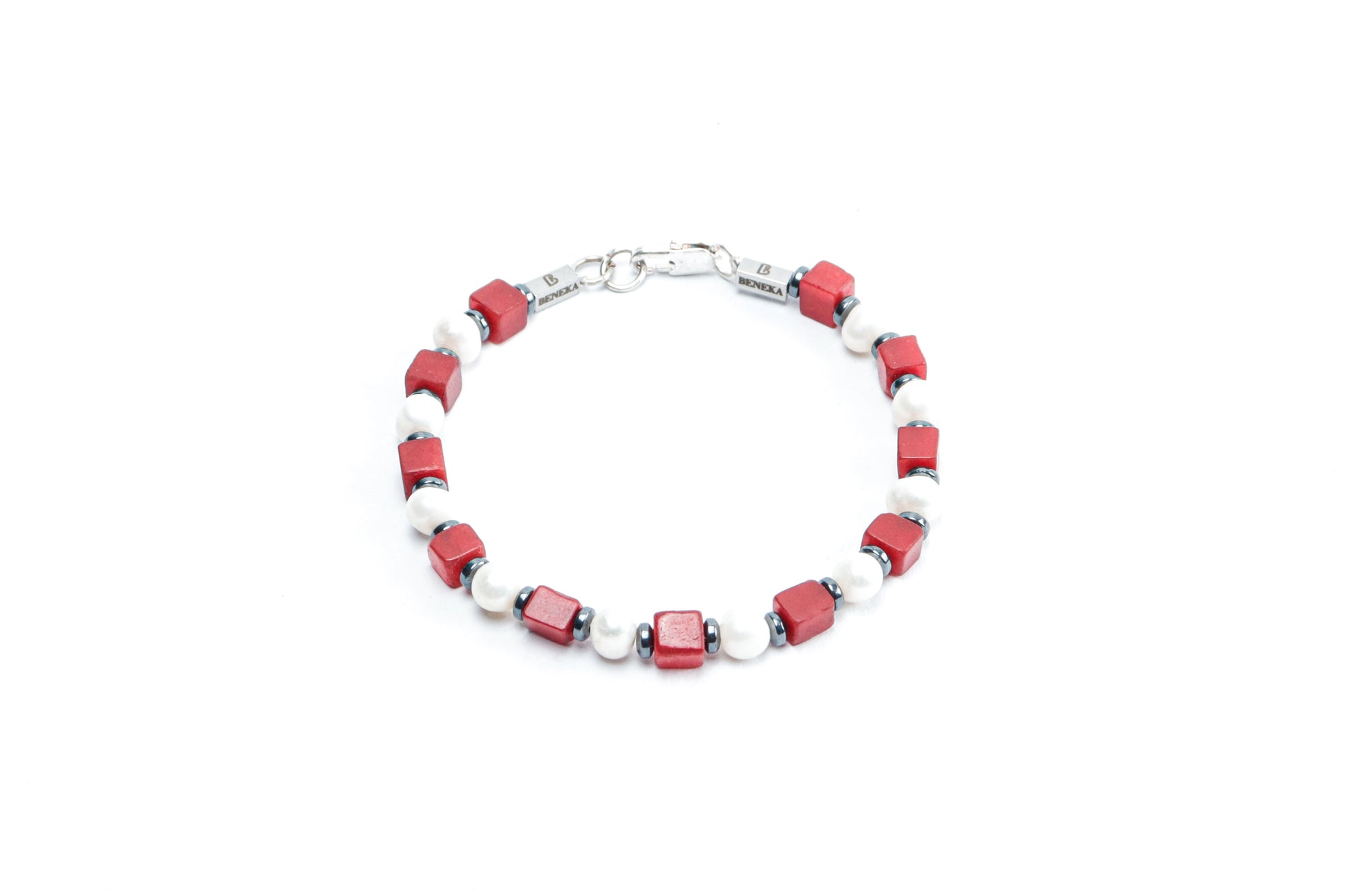A bold union of passion and purity — vibrant red coral meets elegant white pearls. Accented with sleek metallic spacers and a polished clasp for a refined finish. A powerful yet graceful piece designed to stand out with elegance.